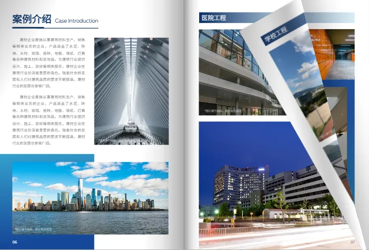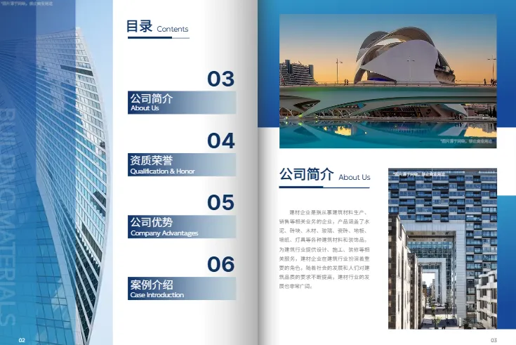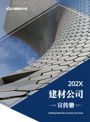 设计特点:主色为深蓝+灰白,更偏工程领域的沉稳风格。封面使用写字楼外立面照片,突出建筑材料行业的专业感。