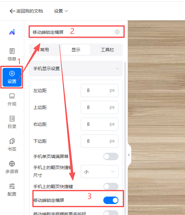 点击【设置】,搜索栏输入“移动端锁定横屏”,勾选【移动端锁定横屏】即可自动保存