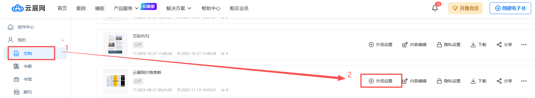 在【文档】页面,找到需要设置的书籍,点击【外观设置】进入。