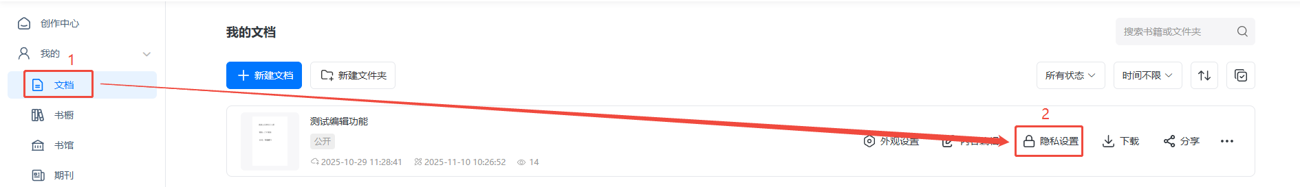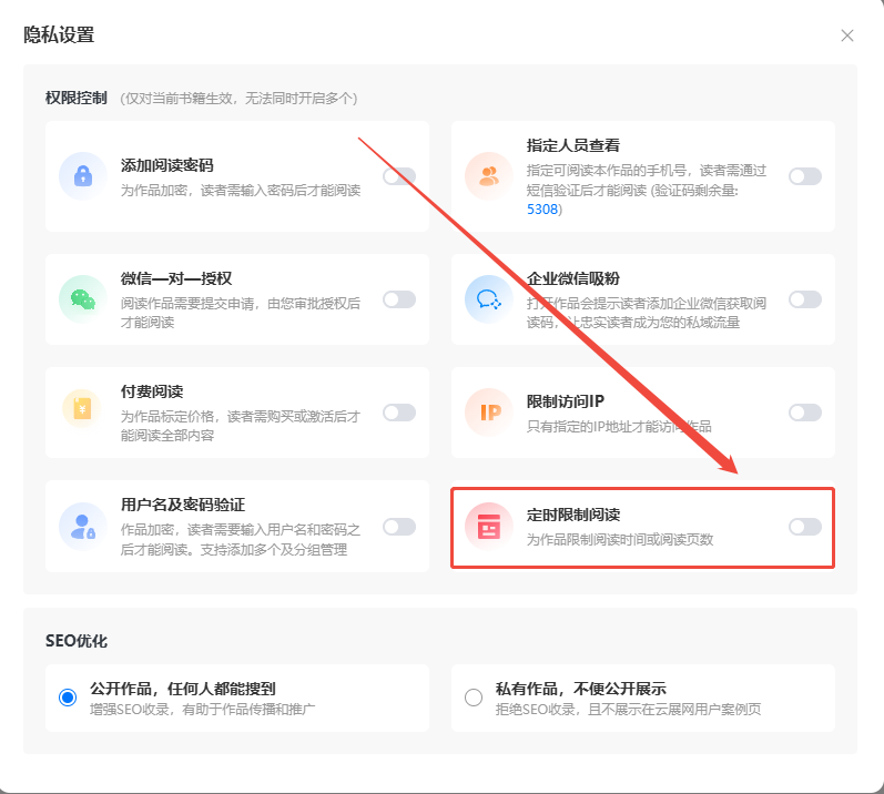 点击【文档】,找到电子画册再点击【隐私设置】,开启【定时限制阅读】。