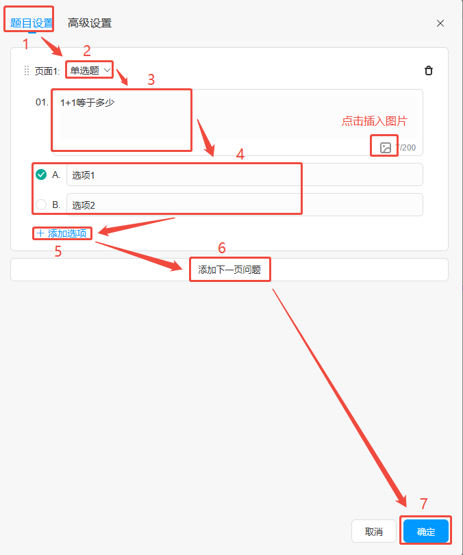 点击【高级设置】,下方设置按钮名称,以及题目编号样式和选项编号样式,最后点击右下角【确定】即可。