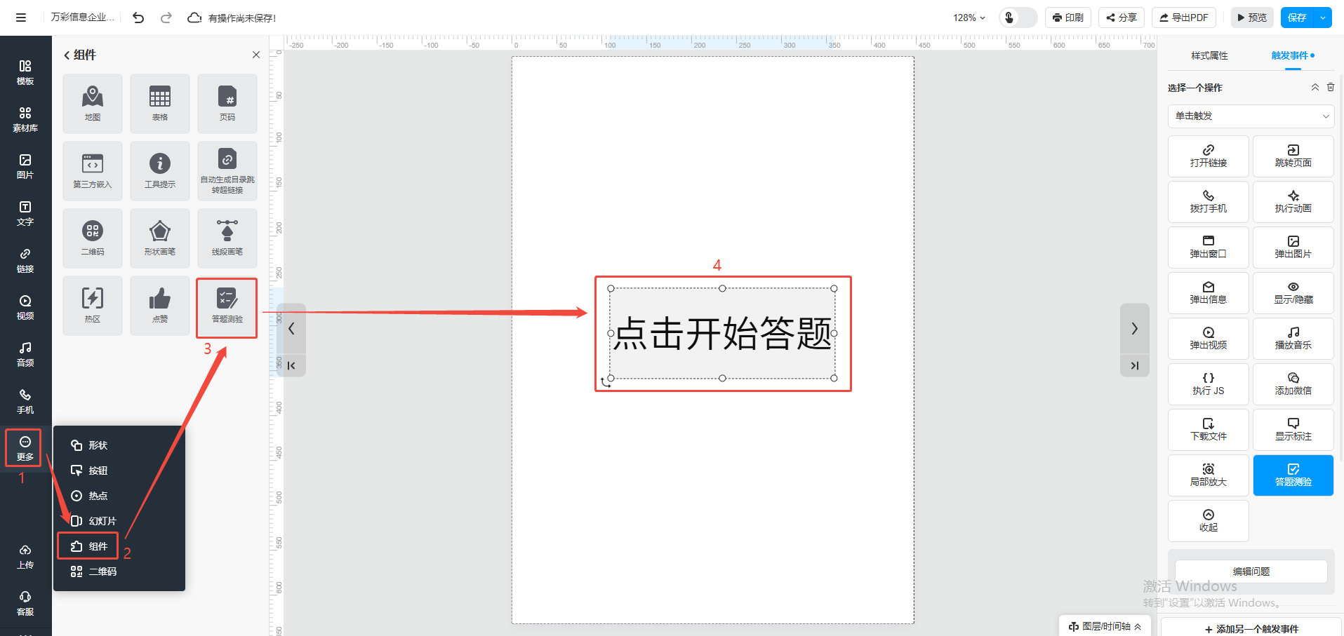 点击【更多】里面的【组件】,然后点击【答题测验】,将出现在页面上超链接框放置到文字或者图片上。