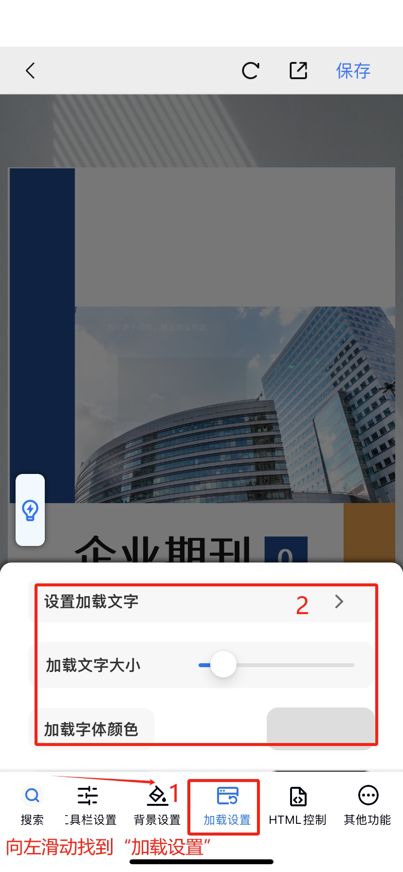 在底部菜单栏,向左滑动找到【加载设置】点击,设置加载页面信息