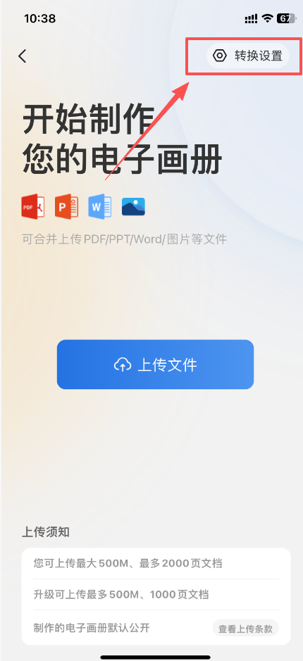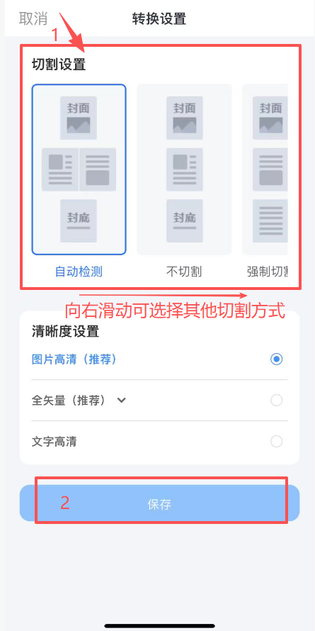 点击【转换设置】打开,选择切割方式后,点击【保存】,随后继续上传文档进行制作