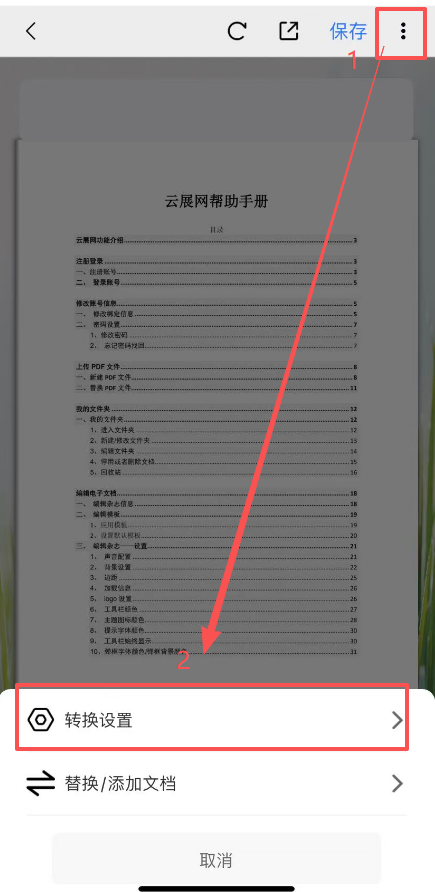 点击右上角“三个点按钮”,点击【转换设置】打开
