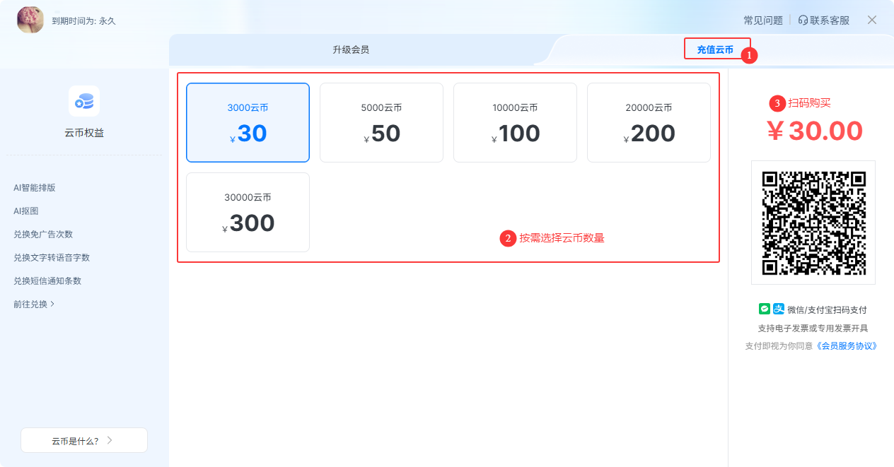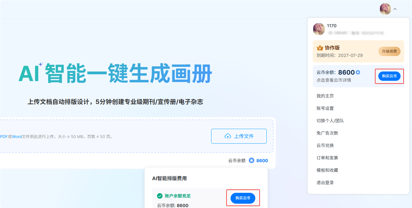 点击右上角的头像,或者在【上传文件】按钮下方, 鼠标悬浮在云币数值上,均可查看当前账号剩余云币或点击【购买云币】,根据自身需要选择购买更多云币。
