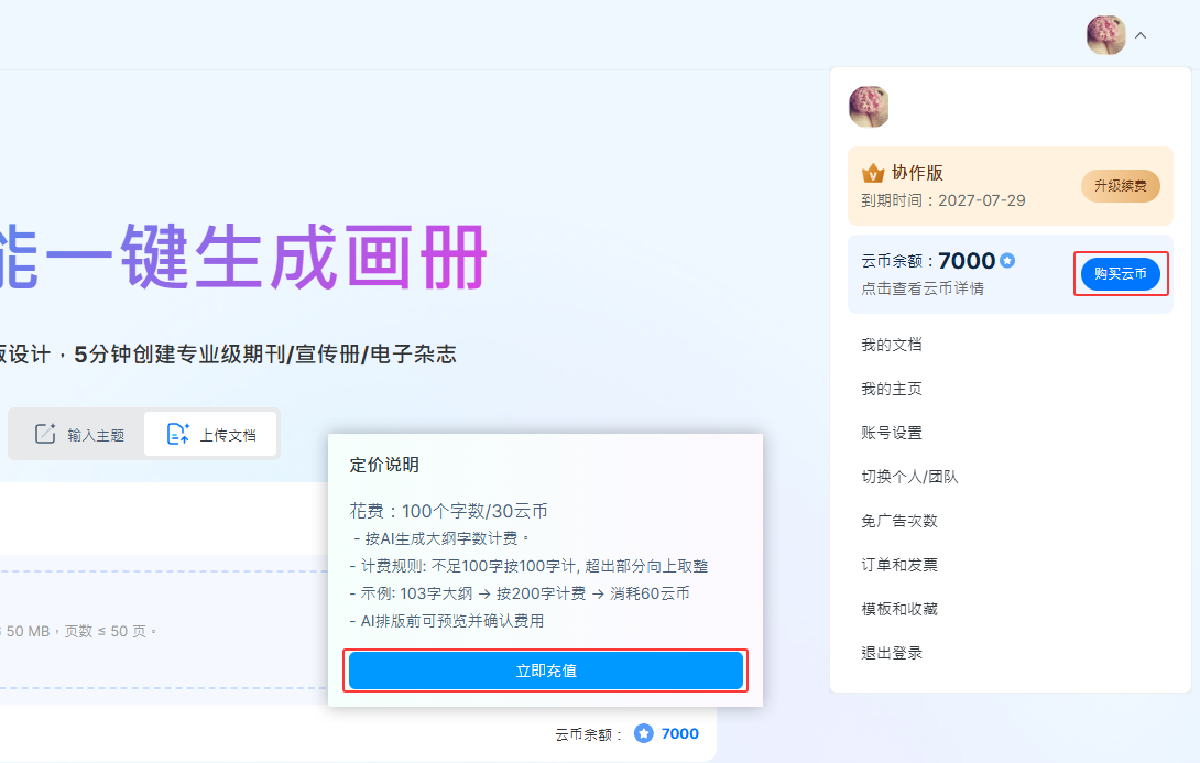 点击右上角的头像,或者在【上传文件】按钮下方, 鼠标悬浮在云币数值上,均可查看当前账号剩余云币或点击【购买云币】、【立即充值】,根据自身需要选择购买更多云币。