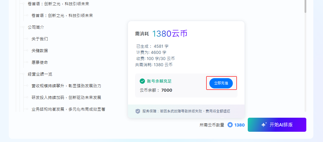服务保障: 若因系统故障导致排版失败,云币将全部返还。