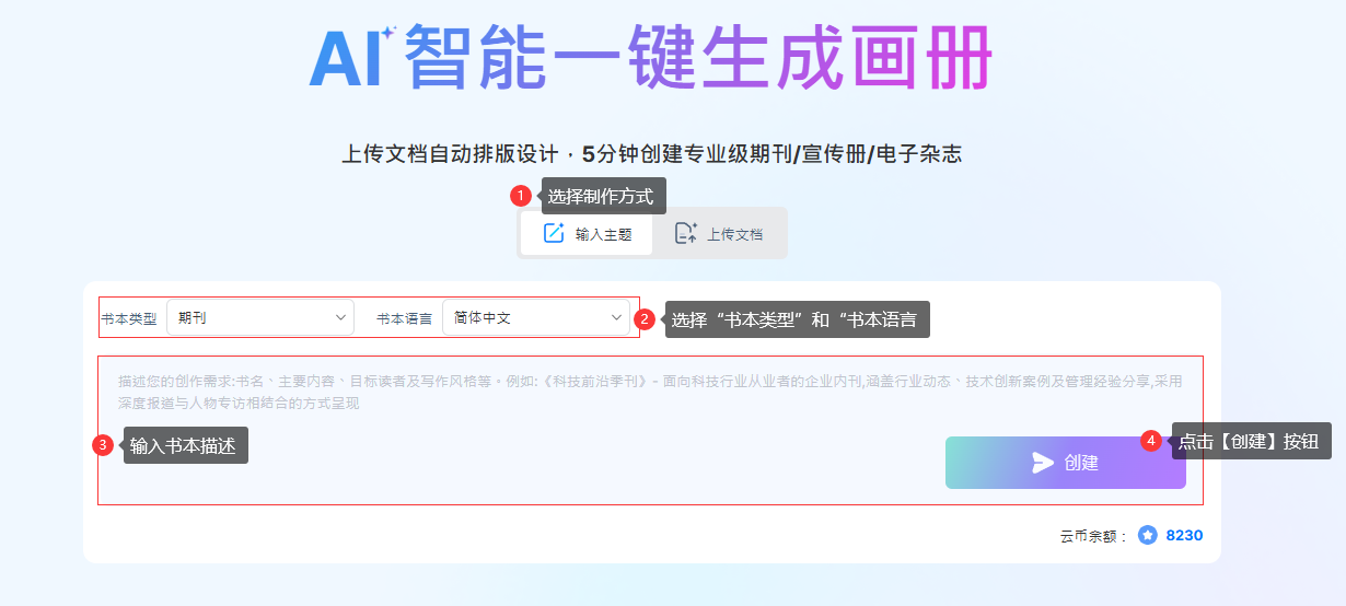 1). 点击【输入主题】→ 选择【书籍类型】→ 选择【书籍语言】→ 在文本框中输入主题描述 → 点击【创建】