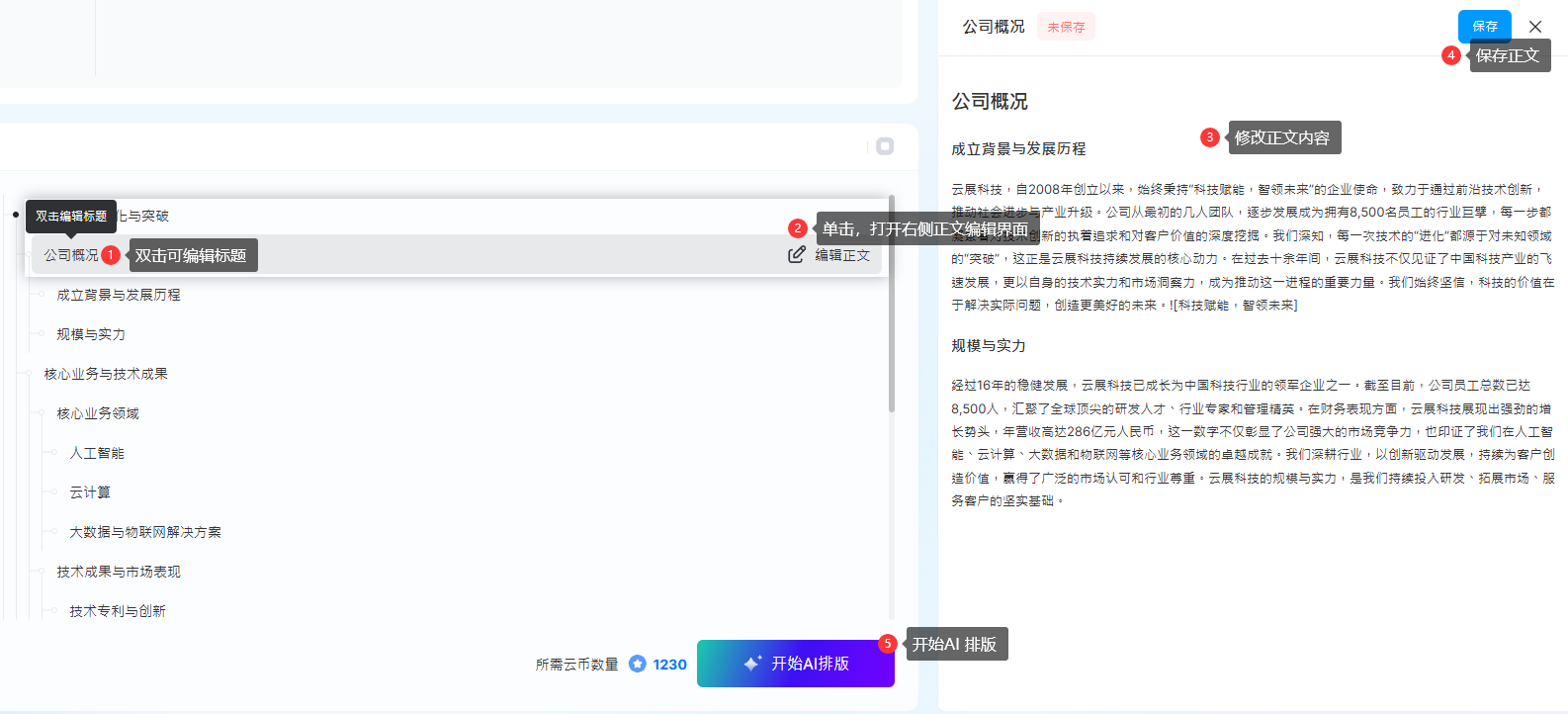 2). 等待AI分析主题并生成大纲 → 编辑大纲标题或正文 → 预览需消耗的云币→ 点击【开始AI排版】进入多媒体编辑器排版。