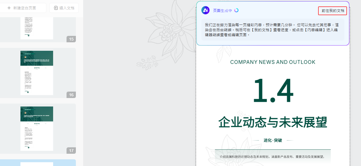 (3)点击【开始AI排版】后, 即进入多媒体编辑器, AI将会逐一渲染页面。无需等待生成完成,您可点击【前往我的文档】继续其他创作。