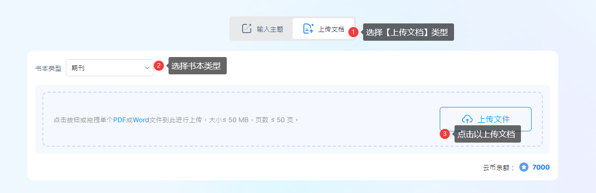 (1) 点击【上传文件】→ 选择【书籍类型】→ 点击【上传文件】或将文件拖入上传框