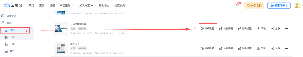点击【文档】,找到对应的书籍,点击【外观设置】打开