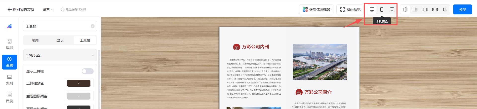 如果您希望读者在阅读电子书时,界面不显示上下工具栏,可以设置隐藏工具栏。