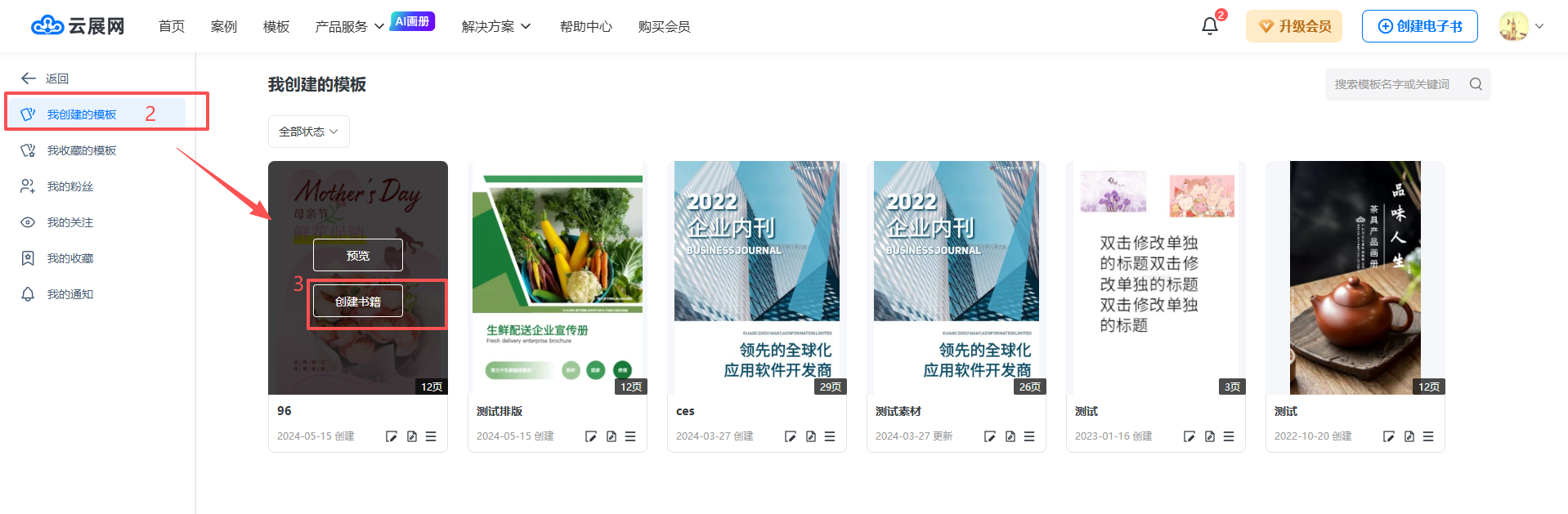 点击【我创建的模板】,选择需要套用的模板,点击【创建书籍】。