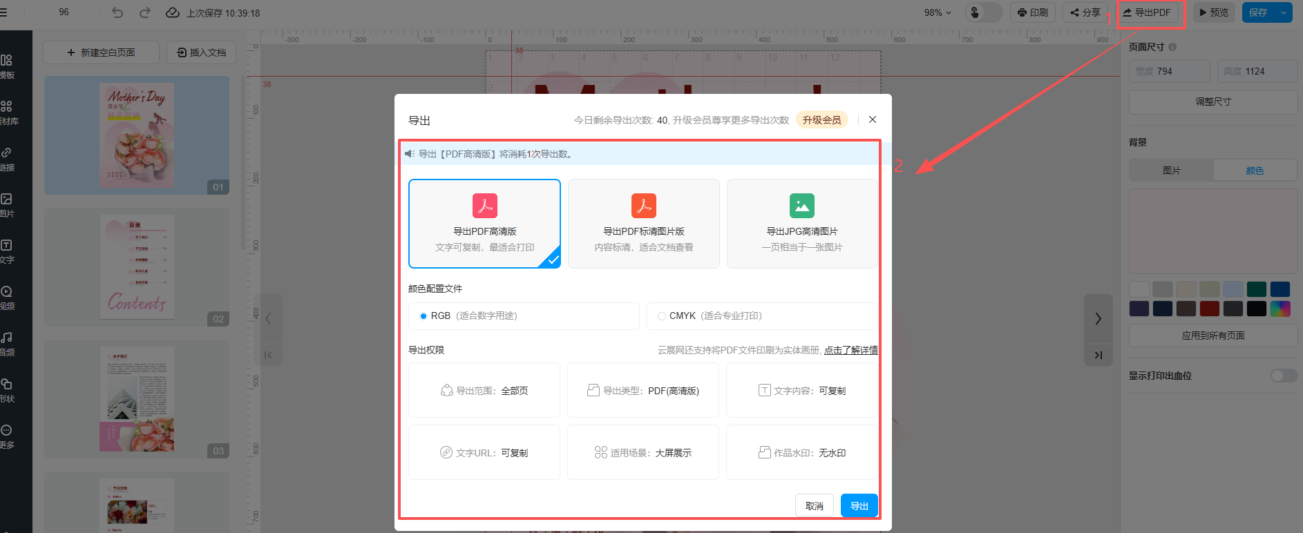 书籍制作好后保存,点击右上角的【分享】/【导出PDF】,即可分享书籍和导出pdf格式。