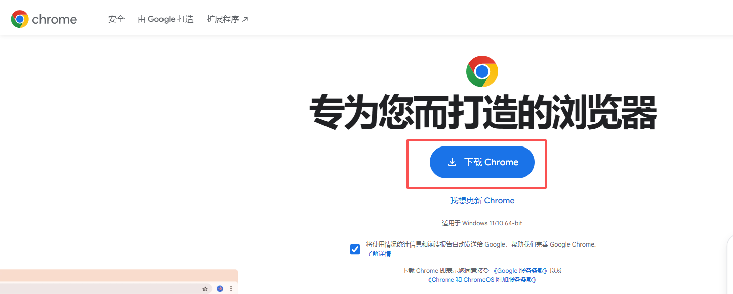 前往谷歌浏览器官网,点击【下载Chrome】下载,网站会自动检测并下载安装程序,下载好后安装使用。