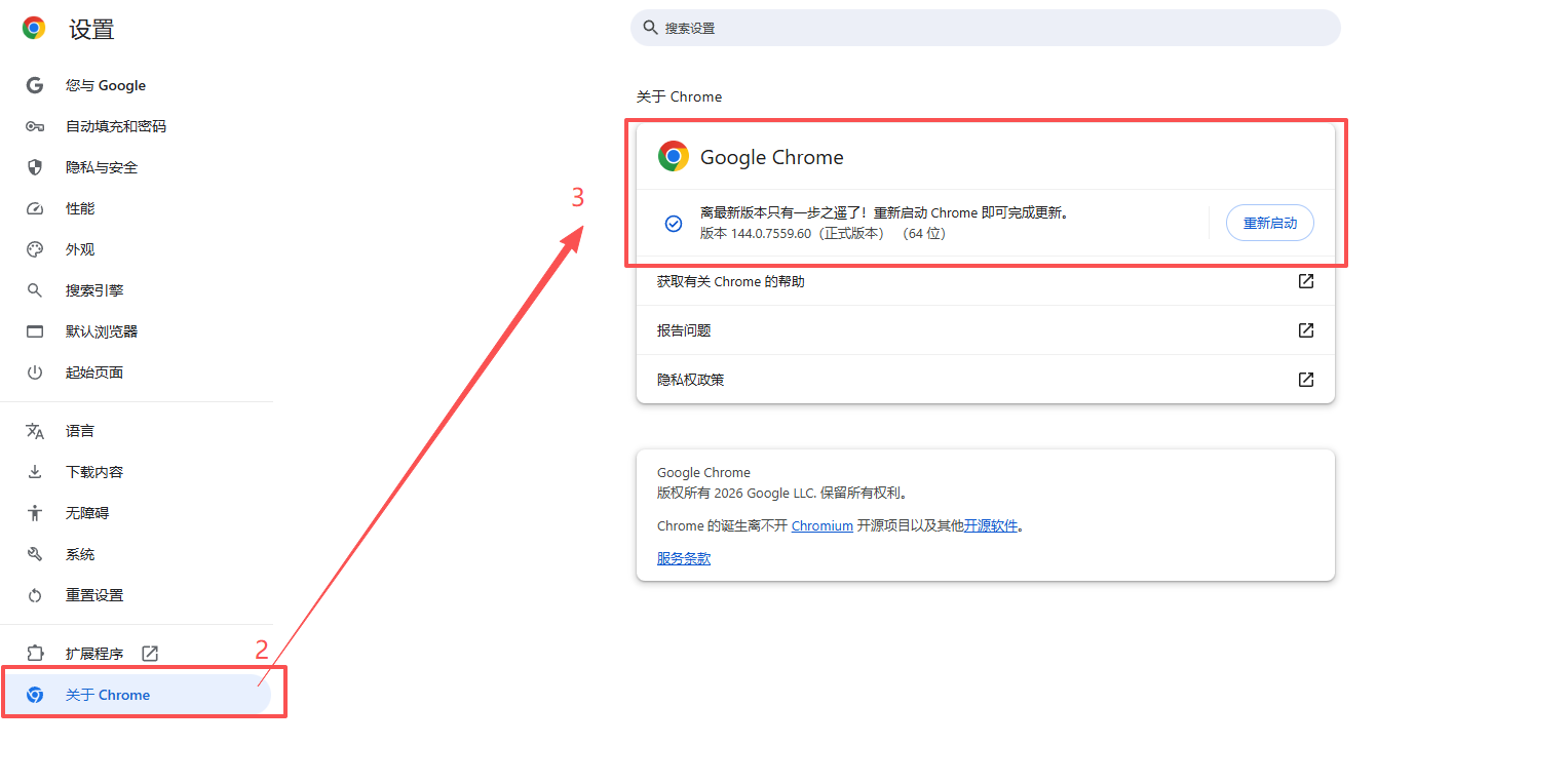 点击右上角三个点图标,点击【设置】,在关于 Chrome页面将自动加载,顶部显示当前版本号(如“版本 144.0.7559.60(正式版本) (64 位)”),若显示“已是最新版本”或类似提示,表明当前为最新版本。若提示“重新启动即可更新”或“有新版 Chrome 可用”,则需更新。