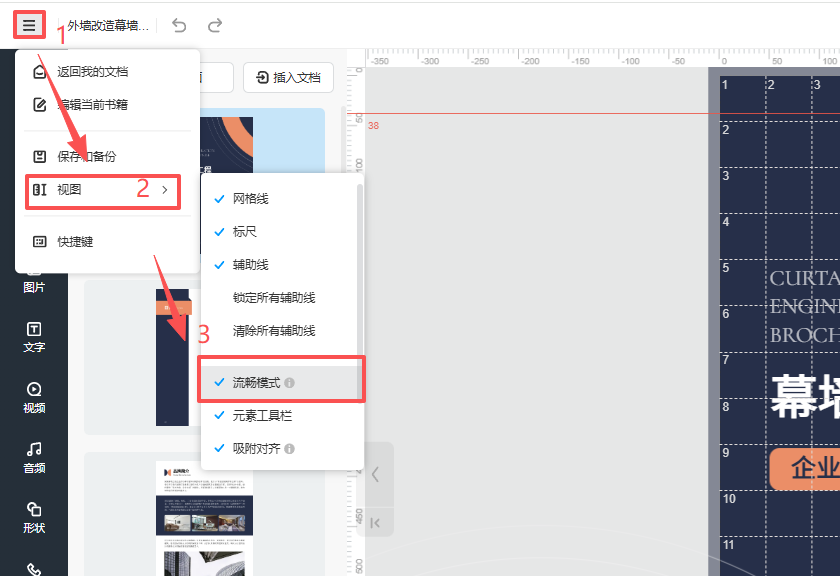 在编辑器里面,点击左上角的三条杠按钮,点击【视图】,勾选【流畅模式】。