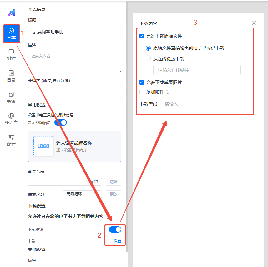 点击【基本】,下方打开下载按钮,电子书的工具栏上就会出现下载按钮,然后点击【设置】,设置下载内容。
