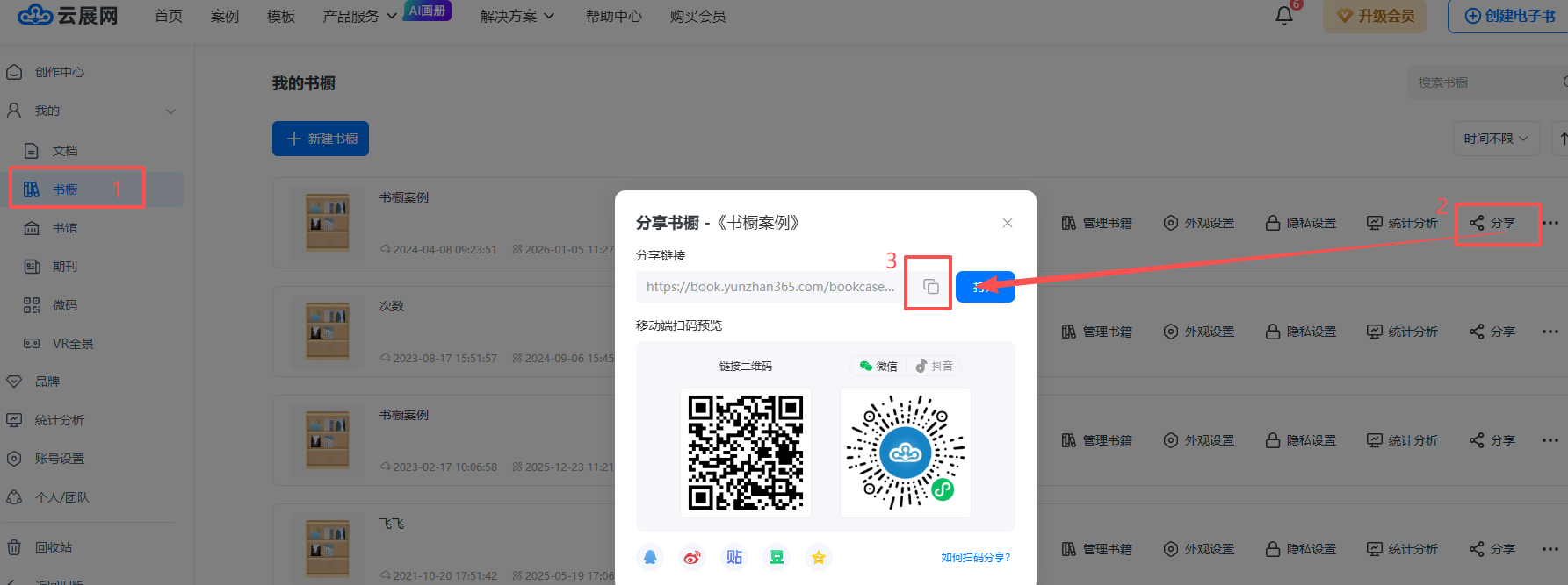 点击【书橱】,点击【分享】后复制书橱链接。如这个书橱链接为:https://baijingtest.sharedbook.cn/bookcase/qbba/index.html