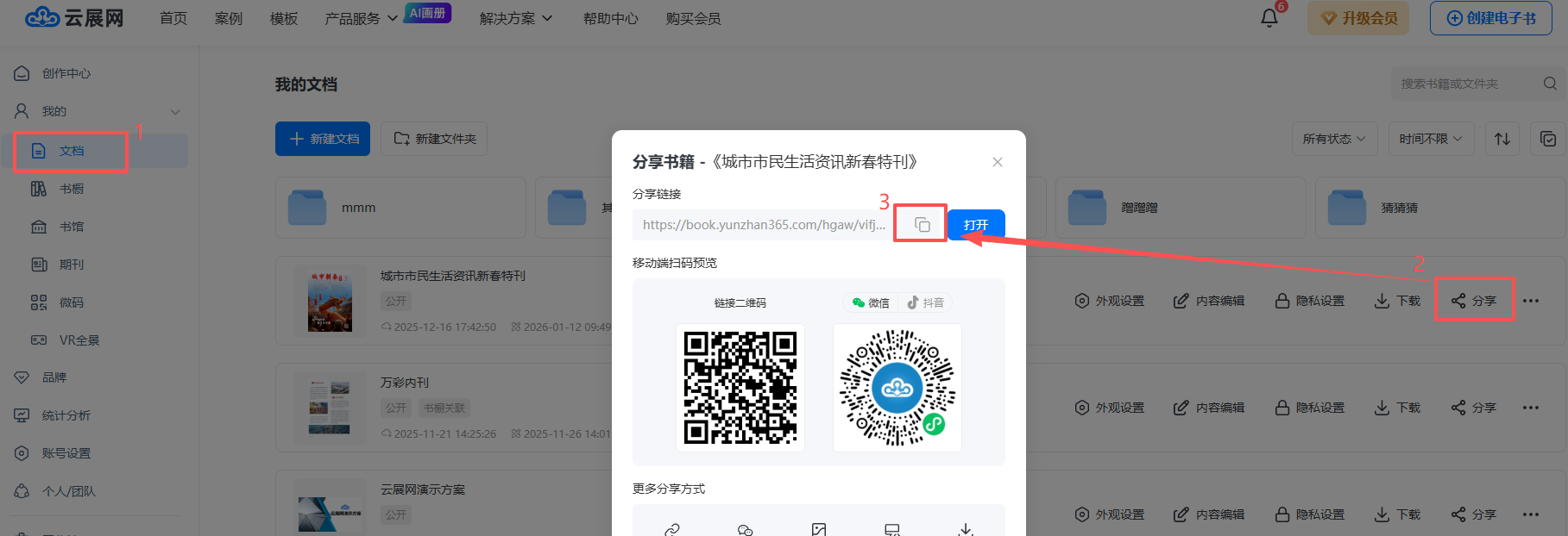 点击【文档】,点击【分享】后复制书本链接,如这本书的链接为https://book.yunzhan365.com/kykh/tppo/mobile/index.html