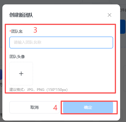 点击【个人/团队】打开,点击【创建团队】,输入团队名以及上传团队头像后点击【确定】,即为创建成功。