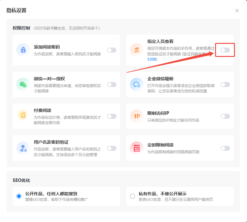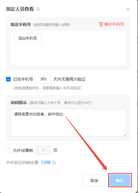 如果你想将电子书/书橱给特定的人看,可以设置指定人员查看功能。指定人员查看就是作者在后台设置哪些手机号可以访问,然后读者打开电子书/书橱的时候需要通过手机号验证,可以有效避免读者分享给其他人看。