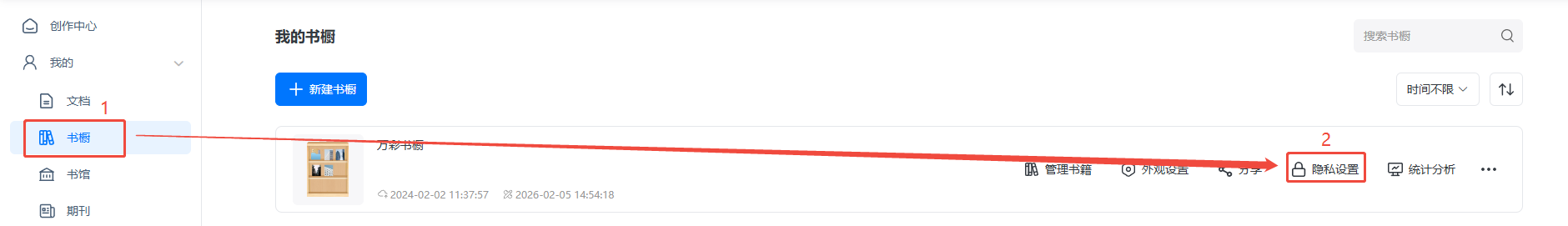 点进【文档】/【书橱】,找到对应电子书/书橱,然后点击【隐私设置】。