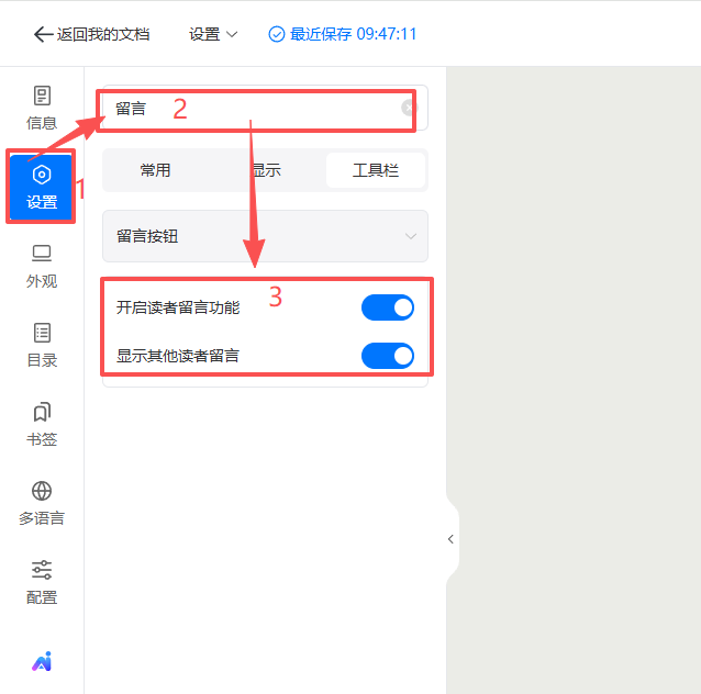 点击【设置】,搜索栏搜索【留言】,将【开启读者留言功能】和【显示其他读者留言】打开。