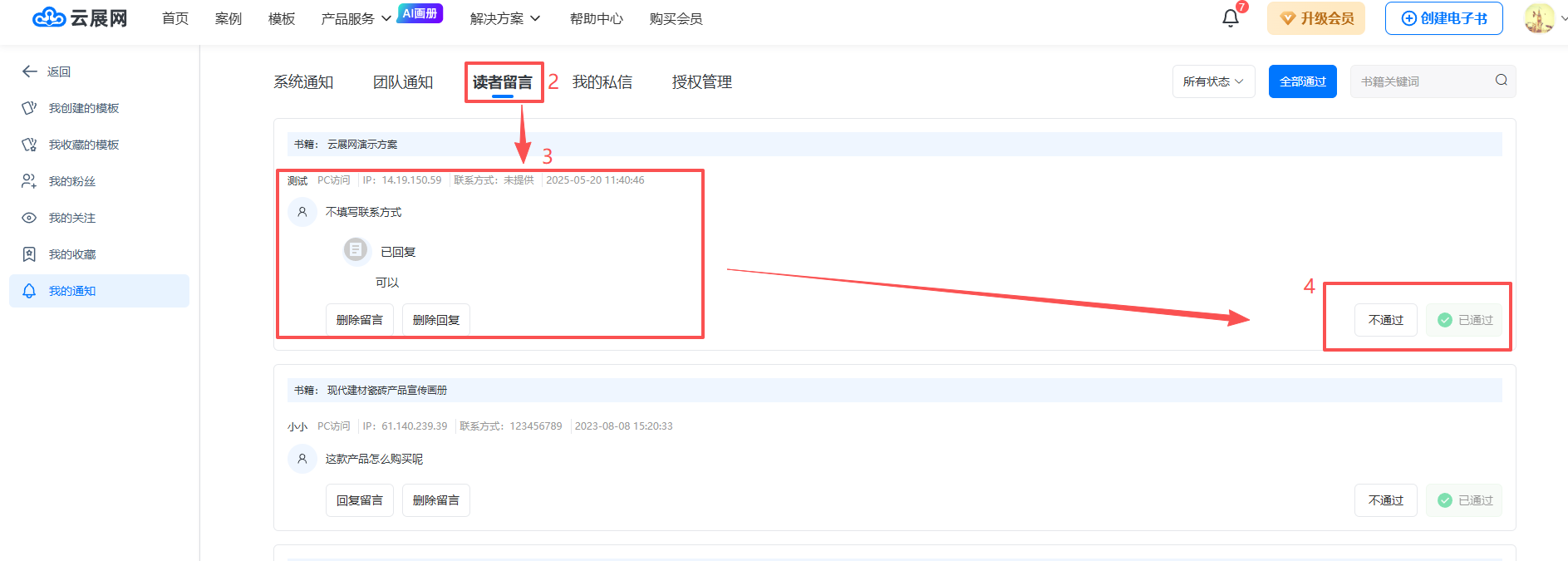 在工作台页面,点击右上角的【🔔】图标,打开【我的通知】页面,再点击【读者留言】,即可看到读者留下的留言、姓名及联系方式。在右侧选择通过或不通过即可。