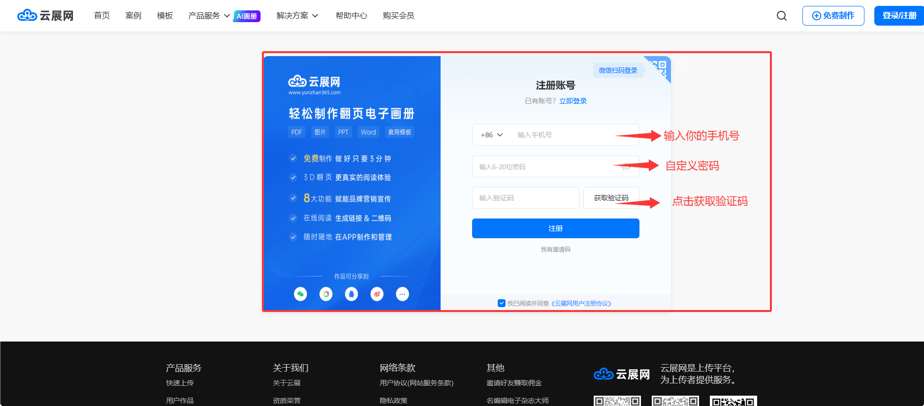 打开注册链接:http://www.yunzhan365.com/signup.php,输入相关资料,点击【注册】后登录。