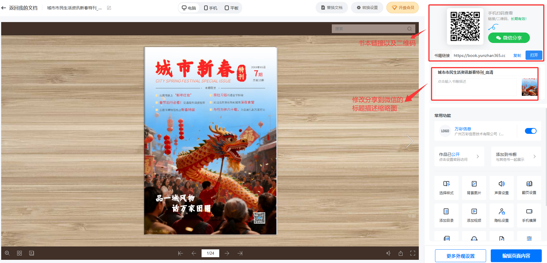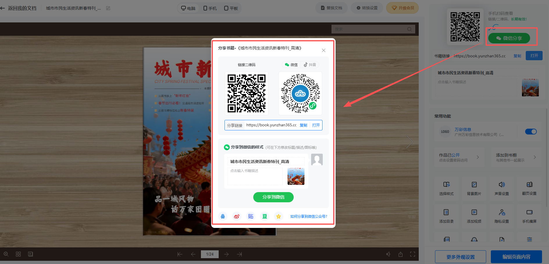上传成功以后生成的书本链接以及二维码可以用于网站,微信(包含朋友圈,好友,微信群,公众号),QQ邮箱等发布。
