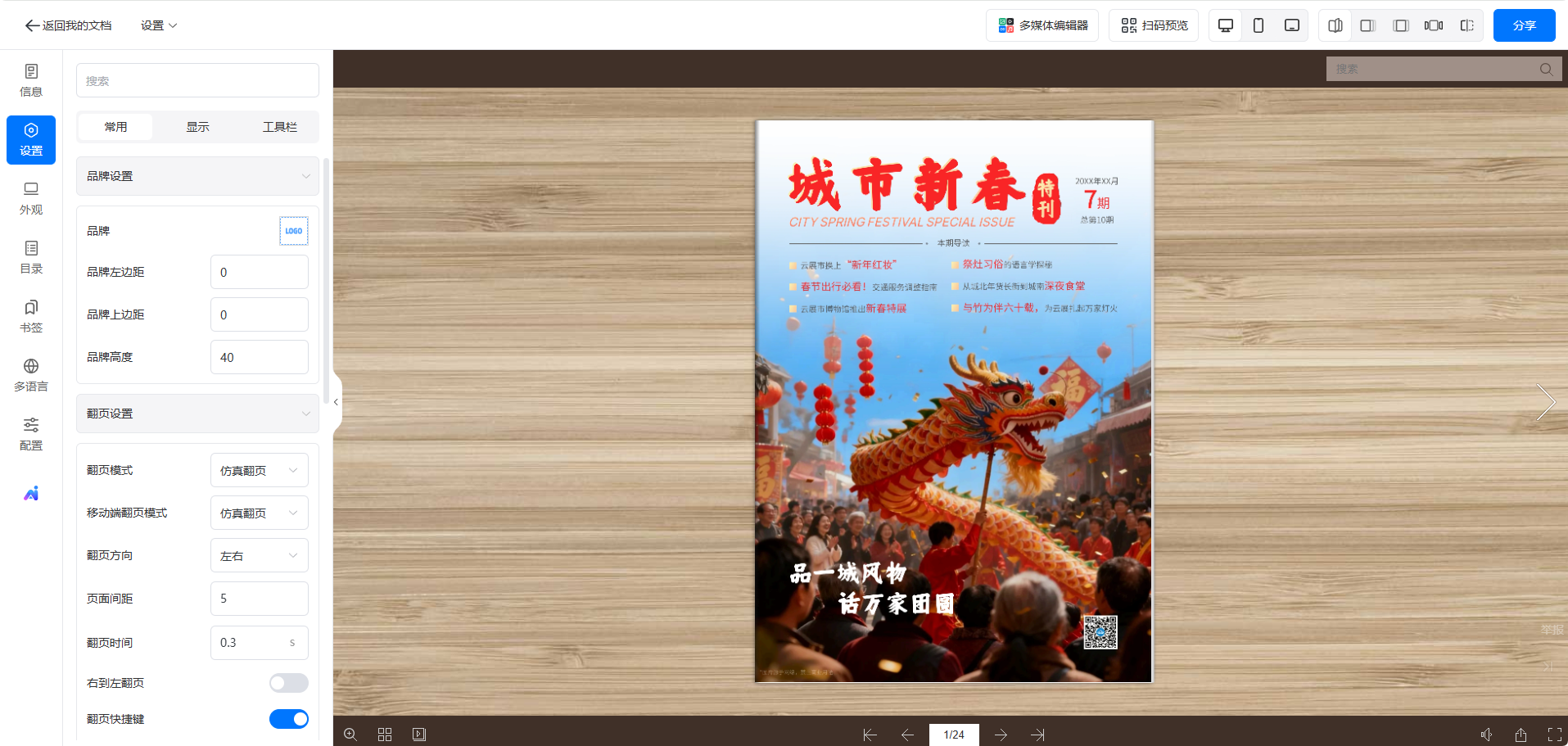 (1)更多外观设置:主要用于给书本设置logo,音乐,背景图,书本阴影,边距,语言,目录,下载等,主要是对书本上下两边的按钮栏进行设置。