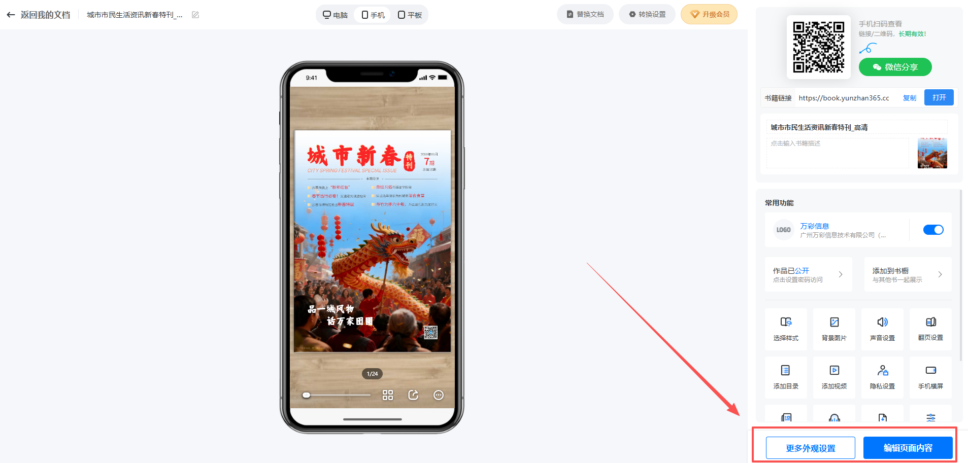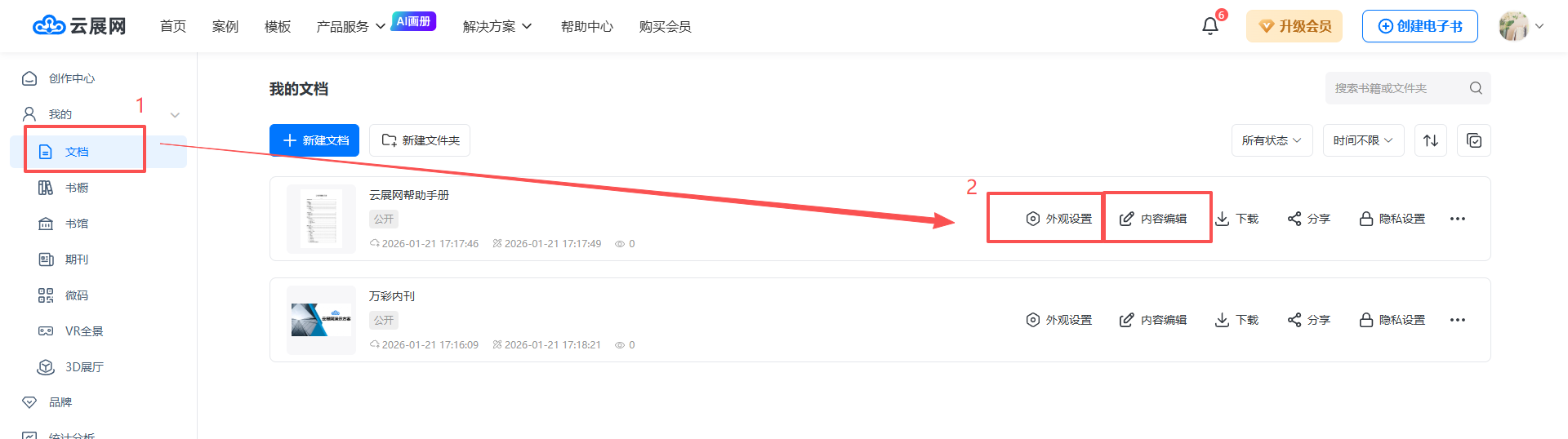 点击【文档】,可以找到书本,点击【外观设置】/【内容编辑】按钮可以继续编辑修改。