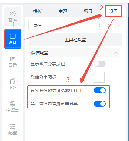 点击【设计】,然后点击【设置】,将【只允许在微信浏览器中打开】和【禁止微信内置浏览器分享】打都打开。