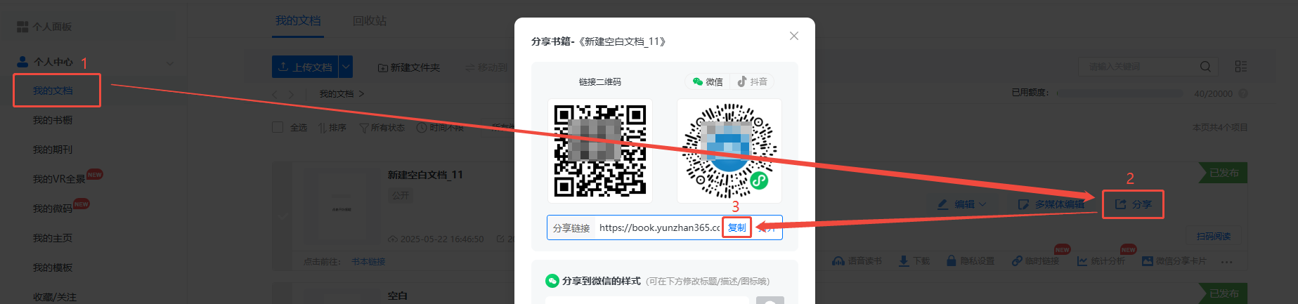 点击【我的文档】,然后点击【分享】,复制书本链接