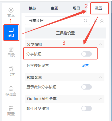 点击【设计】,然后点击【设置】,将【分享按钮】关闭。