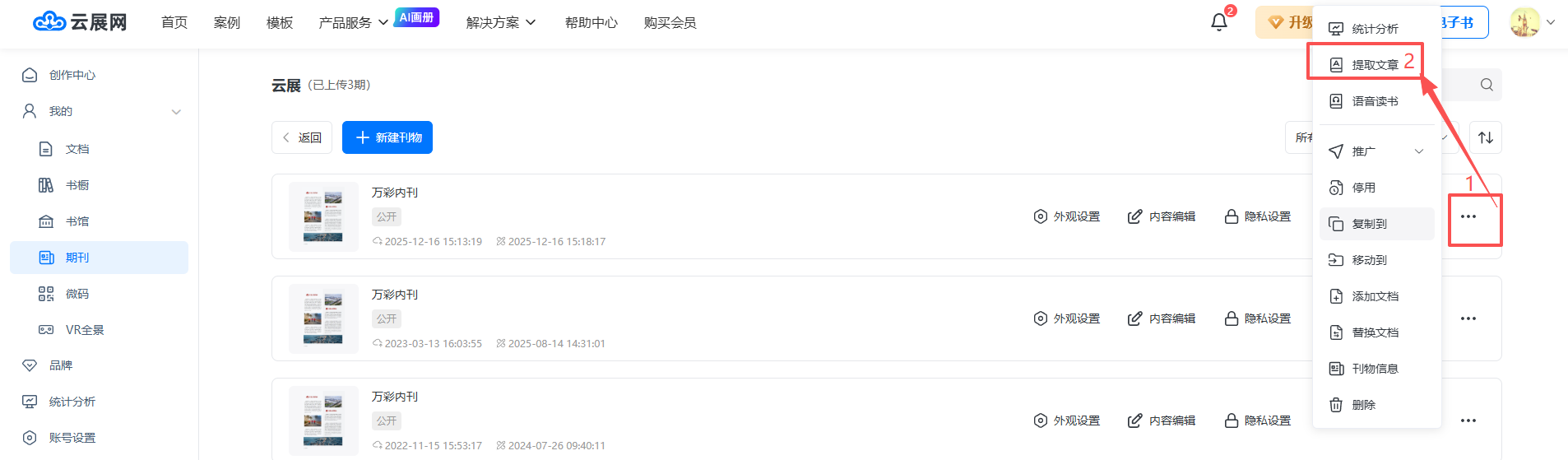 找到对应的书,点击【…】,点击【提取文章】进入编辑页面。