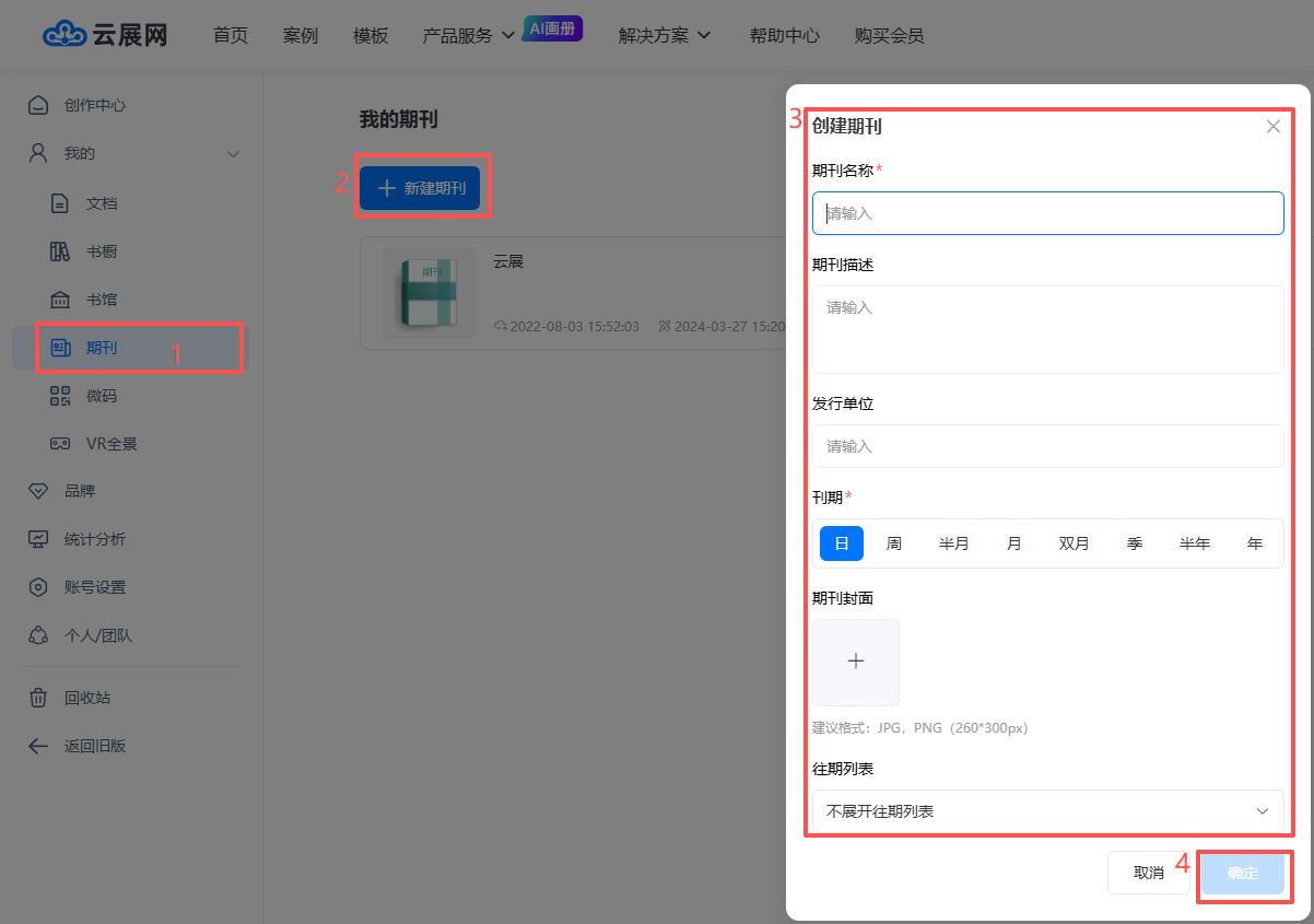点击【期刊】,点击【新建期刊】,输入期刊名称,描述,单位,刊期(如日刊选日),封面,也可以设置是否展开期刊往期列表,设置好后点击【确定】。