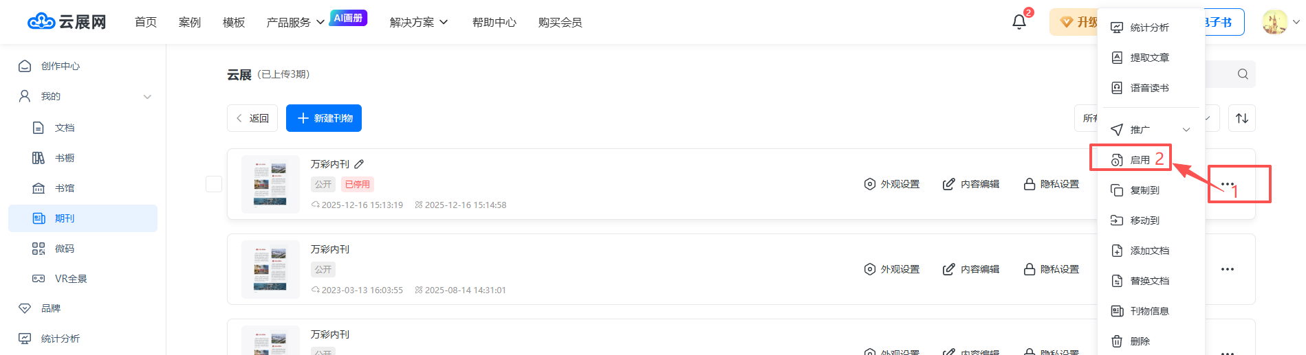 如果想晚点发布,可以先不点发布本期,确定发布了后,到【管理期刊】页面,点击右边的【…】按钮,点击【启用】。