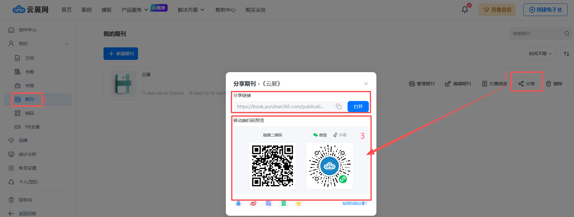 在【期刊】页面,点击【分享】,可以打开期刊链接预览或者用手机扫码期刊二维码预览。