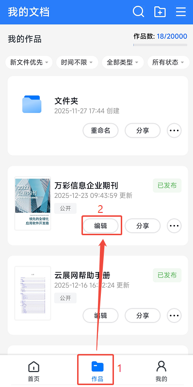 打开云展网app,点击【作品】,然后点击需要设置logo的书本的【编辑】。