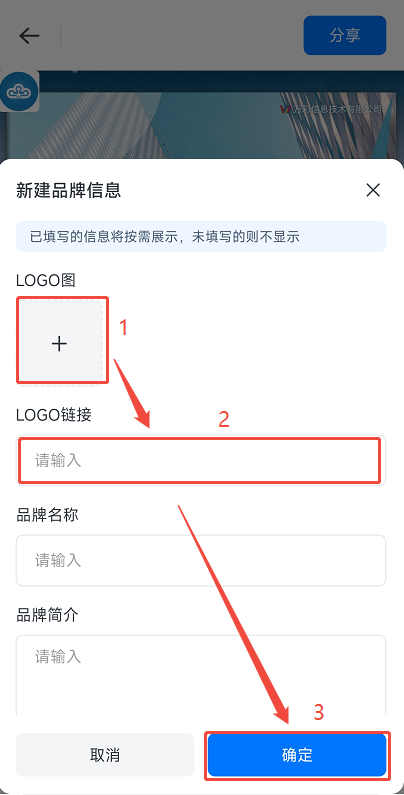 点击【+】上传logo图,然后输入击logo时的跳转链接,最后点击【确定】。