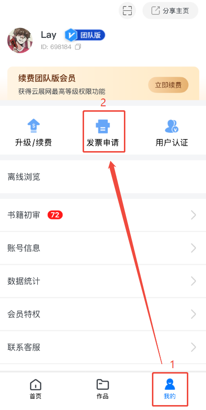 打开云展app,点击【我的】,点击【发票申请】进入申请页面。