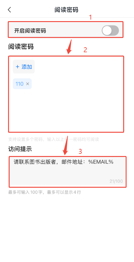 - 设置阅读密码:给书本设置一个或多个阅读密码,读者需要输入正确的密码才可以阅读。