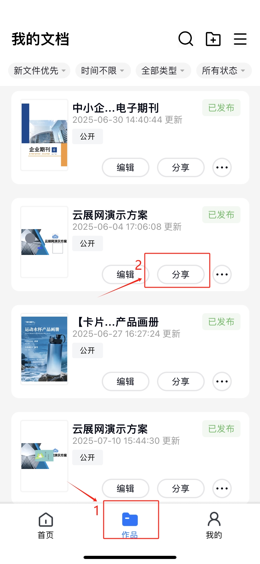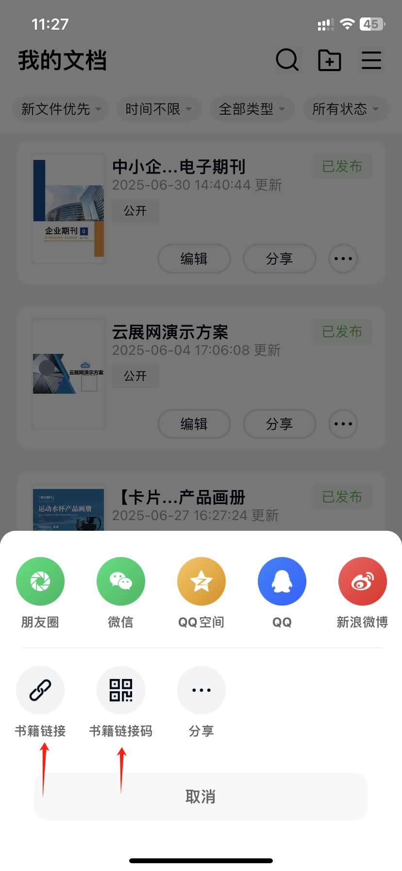 打开云展APP,点击【作品】,点击书本旁边的【分享】便可分别看到有书籍链接/书籍链接码的字样