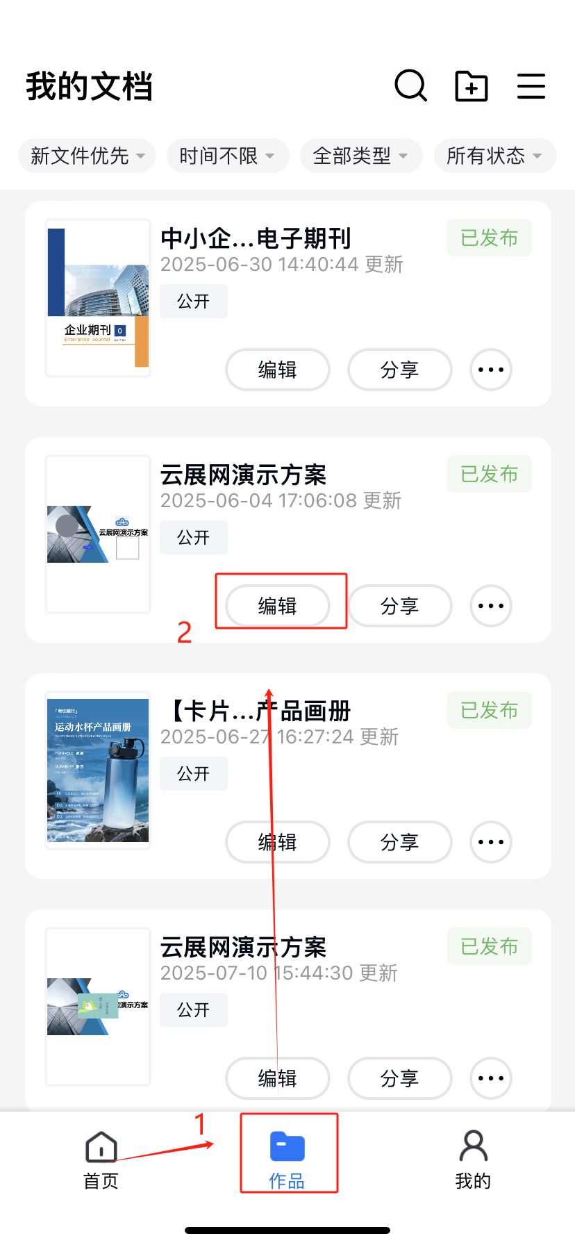 点击【作品】打开,点击【编辑】进入