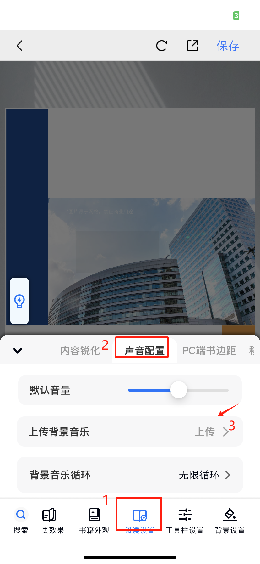 在【阅读设置】,点击【声音配置】,点击【上传背景音乐】上传mp3格式的音乐文件