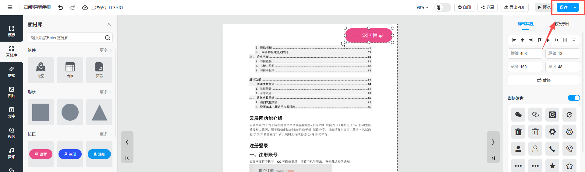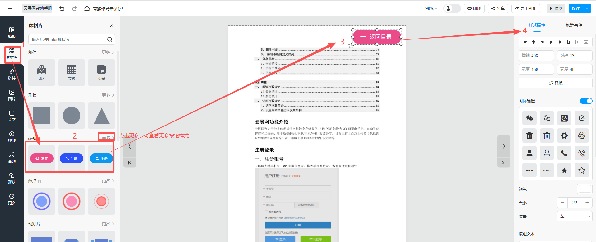 2、点击【素材库】,点击按钮,在页面合适的位置添加功能按钮,双击按钮上的文字将其更改为“返回目录”,右侧可更改图标样式和按钮样式。